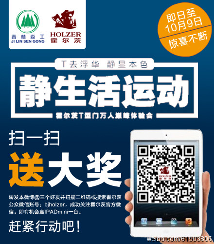 【“T”去浮华 静显本色】 霍尔茨T型门“静生活运动”万人巅峰体验季,中国首家上市森工国企吉林森工霍尔茨门业继“3.15品质万人拼”之后又出惊人之举。转发本微博@三个好友并扫描二维码或搜索霍尔茨公众微信账号:bjholzer,成功关注霍尔茨官方微信。即有机会赢IPADmini一台。