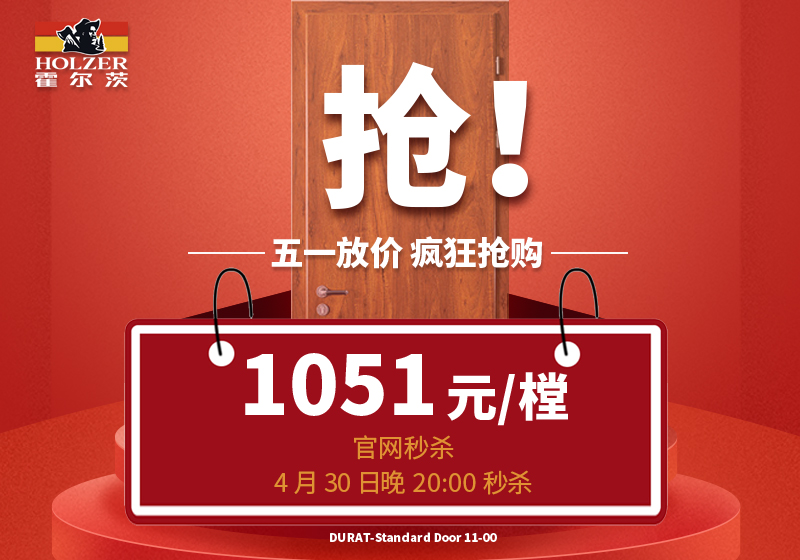 五一放价,疯狂抢购!2021年4月30日 20:00 开始秒杀!秒杀门型11-00,不限花色,不含五金锁具!<凭活动识别码到霍尔茨全国任意门店参与活动>