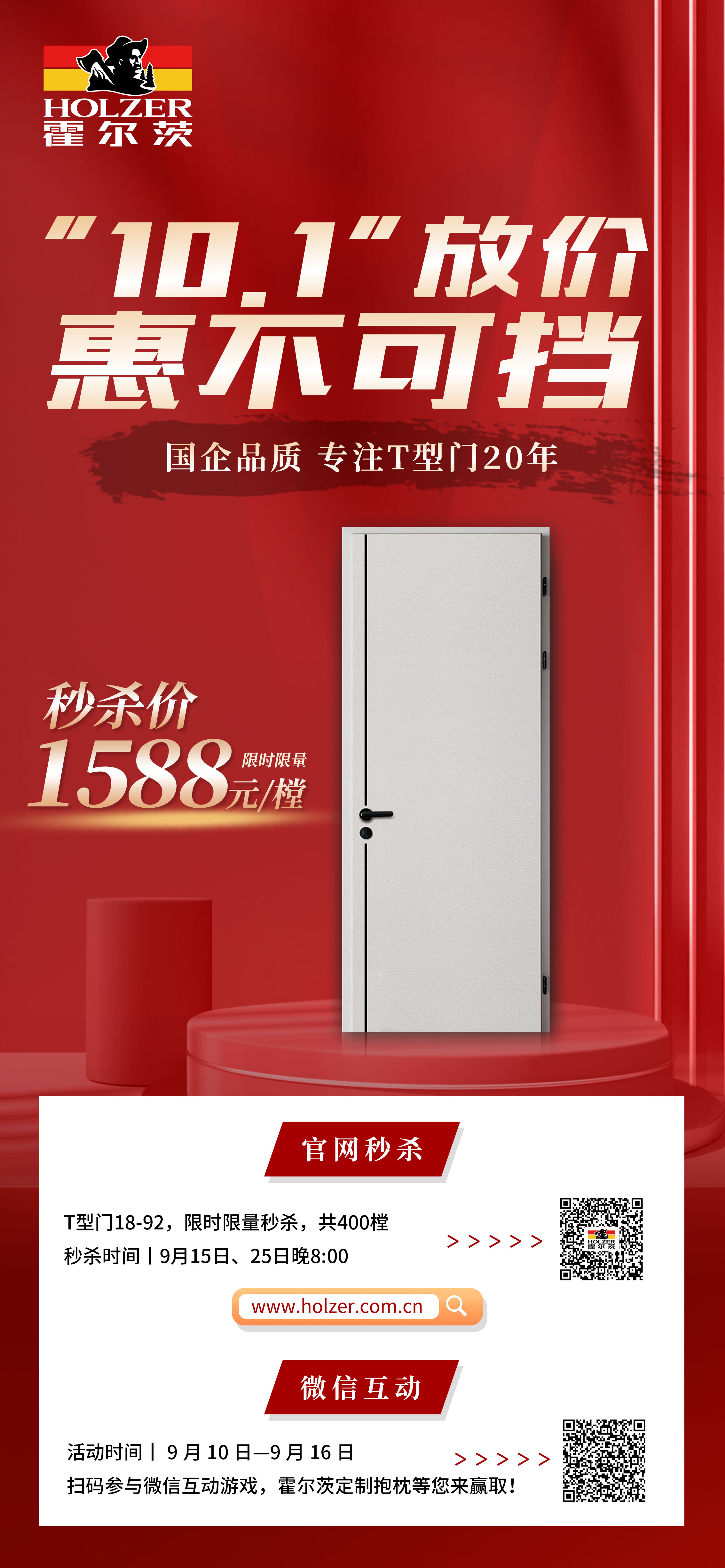 “10.1放价 惠不可挡”,2022年9月15日、 9月25日晚20:00 开始秒杀!秒杀门型18-92,不限花色,不含五金锁具,下单截止时间12月25日!<凭活动识别码到霍尔茨全国任意门店参与活动>